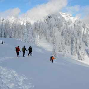 Dans un vallon sauvage, nous remontons un torrent étouffé par la neige. Nous entrons dans une forêt mystérieuse habitée par les chants des chouettes boréales et où la martre chasse l'écureuil. C'est tout en rondeur, tout en douceur pour arriver dans une mignonnette cabane où il fera bon se restaurer.