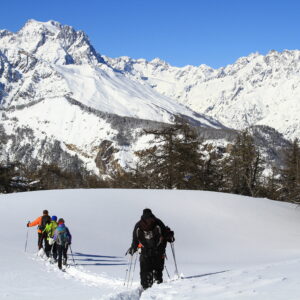 Sur les adrets de Freissinières de nombreux hameaux s'égrainent sur le versant. Ils sont reliés entre-eux par un sentier ancestral dissimulé sous la couche de neige.